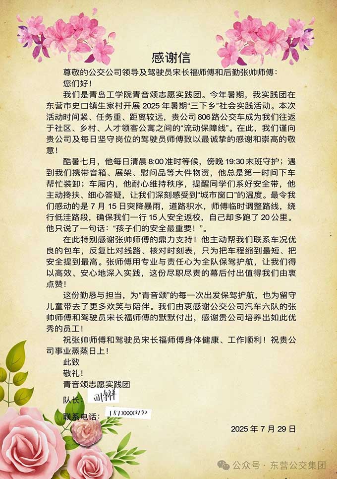 近日,青島工學(xué)院青音頌志愿團(tuán)發(fā)來一封感謝信,感謝東營市公交集團(tuán)駕駛員宋長福師傅熱情服務(wù)。原來,在今年...
